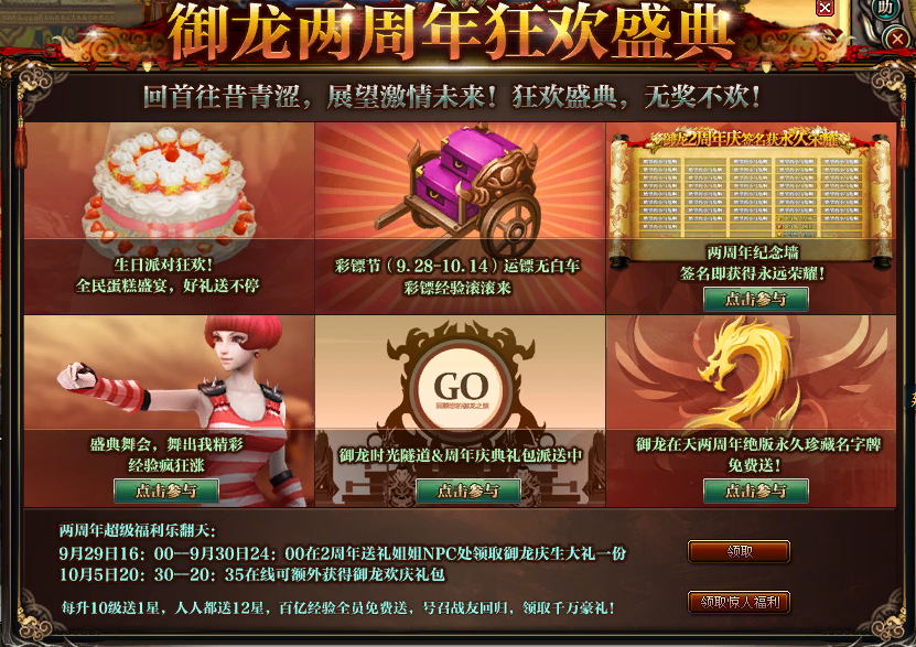 5、为庆祝御龙在天2周年,9月29日16点至9月30日24点,所有御龙玩家找“2周年送礼姐姐”NPC(王城615,546)领取御龙庆生大礼,必得:1000绑金、绑银1~1000锭、上班族7天、紫色经验牌碎片(非绑定,3个碎片合成1个紫色经验牌);还可能额外获得:紫色换镖令、王者龙心、影·金麒麟3天(非绑定),不要错过。