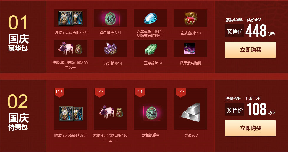 国庆豪华包:内含2周年时装无双盛世30天*1,当前等级段随机极品紫色装备*1(最高等级为149),紫色换镖令*1,六等体质、物防、法防宝石随机*1,玄武血剂*40,宠物猪与宠物口粮*30二选一,五等精华*4,五等碎片*4。原价1088Q币,售价498Q币,现在购买享受预售价448Q币。