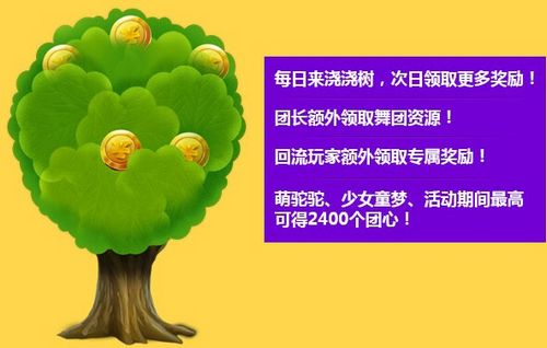 最新的浇树玩法闪亮登场,每天来浇树,次日即可领取更多奖励。团长还可额外领取舞团资源!回归玩家免费领礼包。2400个舞团之心等着您!