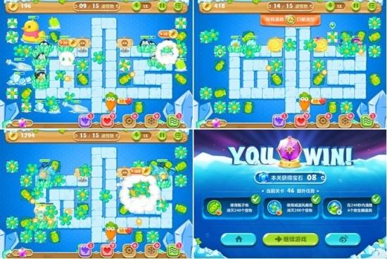 在游戏过程中,可先完成清除救生圈道具的任务,在地图左下角空白处安装瓶子炮,并升级到顶级,消灭来袭怪物,并在地图右下角安装瓶子炮,选择清除上方的救生圈道具,获得减速风扇塔,继续清除大黄鸭后,选择清除右侧怪物出口处救生圈道具,接着逐渐清除左侧剩余救生圈道具。随着游戏的进行,怪物数量增多进攻速度快,而且怪物会同时从两个怪物出口进攻,玩家需要同时注意两侧怪物,加强两侧的攻防布局,在怪物进攻沿线多安装瓶子炮或减速风扇塔,这样有利于消灭所有来袭怪物,获得道具全清、金萝卜和钻石全部成就。