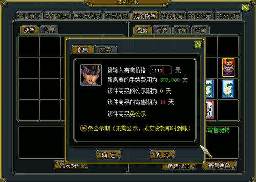 4、免公示寄售成功的角色进入免公示期列表,玩家可正常购买(注:免公示期出售的商品与寄售期出售商品一样,一经交易成功不予找回)