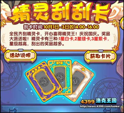 2、精灵卡有1星白卡、2星绿卡、3星紫卡三种。星级越高,刮出的奖励越好,还有可能收获幽系精灵王哦!