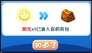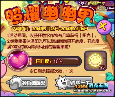 3、幽幽果沐浴阳光可以增加幽幽果的开心度,开心度达到100就可以领走可爱的幽幽果了哦!每次需要消耗5个阳光,每次可以增加8点开心度!所以洛克们需要5天才能获得幽幽果哦!