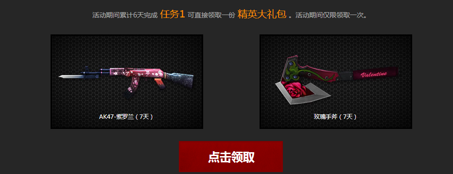 活动期间累计6天完成任务1可直接领取一份精英大礼包。活动期间仅限领取一次。