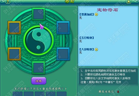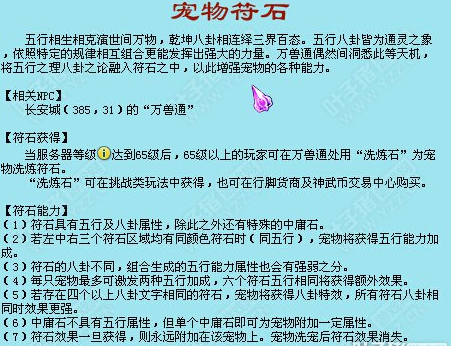 宠物符石的使用需要通过洗练石来获得,洗练石内涵属性有五行:金,木,水,火,土。以及八卦属性。