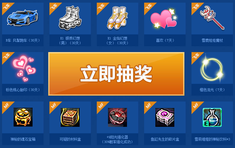 当天登陆《魂之猎手》在线满30分钟,且登录《QQ飞车》,即可获得一次抽奖机会抽取奖励,并百分百获得奖励(礼包领取及抽奖机会当天有效,请在当天及时领取礼包及参与抽奖,活动期间可反复参与)。