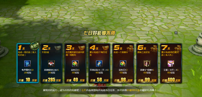 活动期间,所有登录《英雄三国》游戏新玩家,均可参加针对新玩家订制的独享活动,七日内连续登陆并完成当日任务,可获得对应价值899元宝的精彩礼品哦!