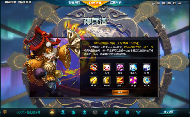 神兵谱:右键打开共有10个英雄的天命武器任你选择,可任选一个新英雄的天命武器作为奖励。