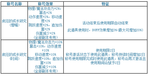 活动内容:活动期间,用所有角色登陆时获得“疯狂的成长研究(增幅)”与“疯狂的成长研究(时间)”,并将强制装备“疯狂的成长研究(时间)”称号。