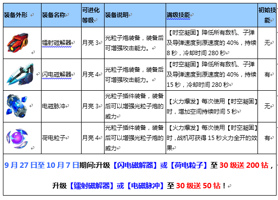 新版装备系统激爽玩法火热体验中!装备的实用性、丰富性、进化潜力是最受玩家重视的三个要素。为了让玩家迅速上手,同时提供更多的搭配组合,9月27日至10月7日《全民飞机大战》特在国庆期间上架四款新装备并且开启装备升级送钻活动,让你的装备背包迅速装满,空战实力一升再升!四款新装备详细介绍与送钻机制请参见下表: