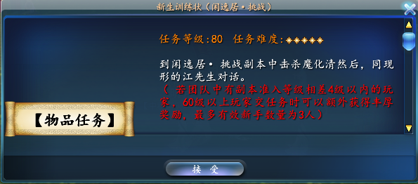 60级以上玩家如果同副本准入等级4级以内的玩家共同副本,交任务时可以额外获得丰厚奖励,最多有效新手数量为3人。