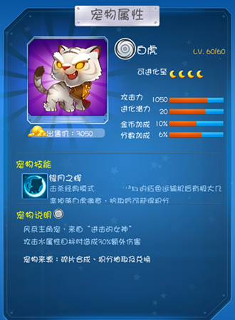 宠物说明:风系主角宠,来自“进击的女神”,攻击水属性目标时造成30%额外伤害。