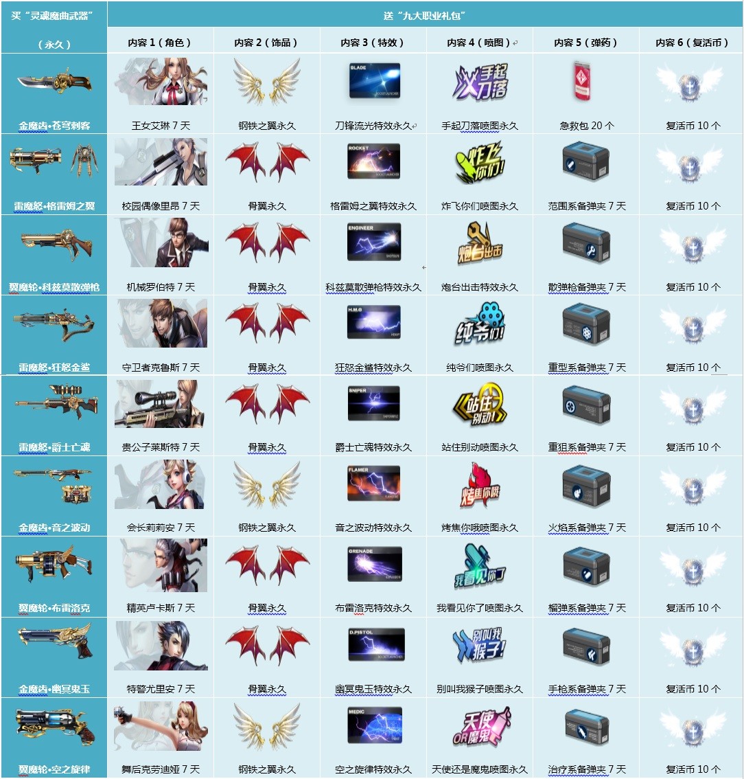 9月26日至10月8日期间,商城将限时特卖“灵魂魔曲”系列武器,原价33500点券,活动期间只需26800点券即可轻松将永久武器、职业礼包带回家!金魔齿·苍穹刺客(刀锋)、雷魔怒·格雷姆之翼(导弹)、翼魔轮·科兹莫散弹枪(工程师)等9大职业专属武器造型精致、性能极佳,在伤害、便携性、载弹量、稳定性等方面都有出色的表现。除此之外,玩家购买“灵魂魔曲”系列武器,还将额外获赠九大职业礼包,内含永久枪神之翼道具、永久特效、永久喷图、7天角色皮肤、备弹夹和10枚复活币。谁说便宜没好货?在这里,低价也可以坐享超多惊喜!