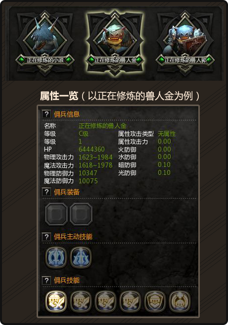 - 3种正在修炼的佣兵(包括:小淑、兽人金、兽人郭)都是C级佣兵