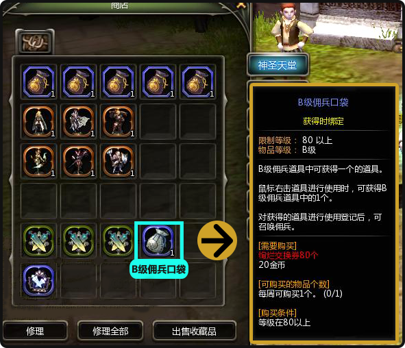 【B级佣兵口袋】仅限80级以上角色使用,且存在每周可购买次数上限。