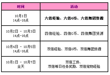 10月1日14-18点期间,我们为大家准备了六倍经验、六倍G币、六倍舞团资源活动!其他活动期间我们也同样为大家准备了四倍、双倍活动,切莫错过哦!