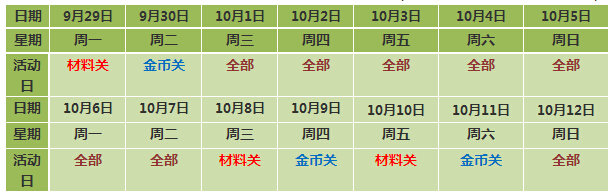特别关卡活动在10月1日至10月12日期间的开放时间安排如下(其中国庆七天假期全部开放哟):