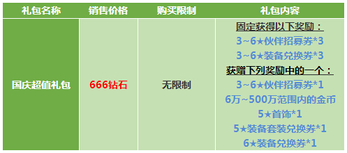 活动期间,商城中的“幸运广场”将会上架新商品“国庆超值礼包”,包含丰厚的超值内容,无论是迅速增强实力,还是着眼投资未来,都是非常划算的!限期销售7天,不限购买次数!