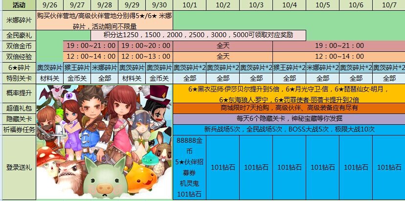 10月4日~12日,每天12:00~14:00开放双倍经验活动,19:00~21:00开放双倍金币活动。