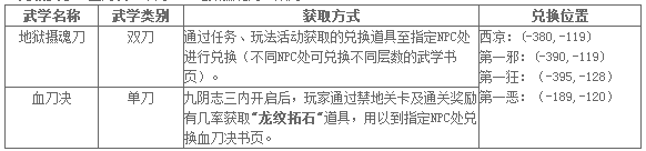 7.关联门派武学:非易容、下山状态的玩家进入血刀门后可以在东方南方(-180,-119)处兑换学习:失魂刀法1-7层;鹰爪拳1-7层;追魂爪1-7层。