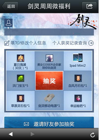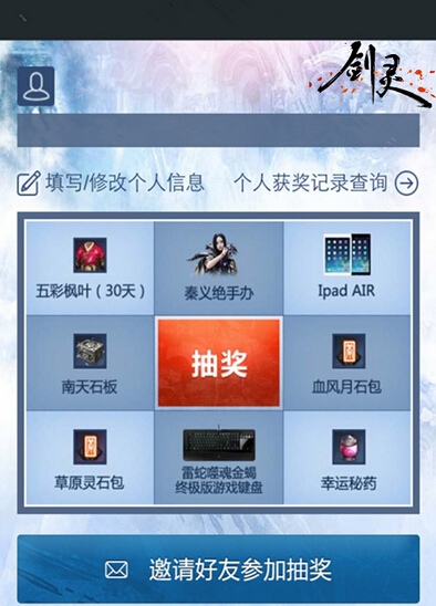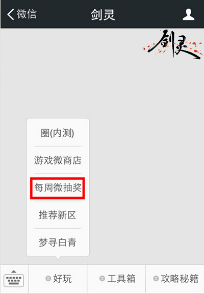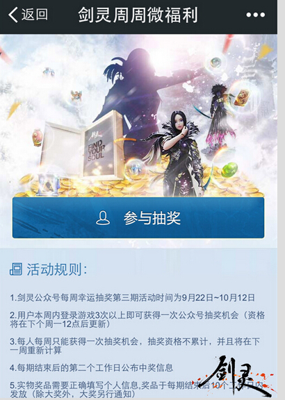 《剑灵》官方微信号:lovebns,关注剑灵微信后,点击“好玩”一栏,就能看到“每周微抽奖”活动,玩家每周登陆3次游戏,可对应获得一次抽奖机会。每次微抽奖都以一周时间为一期,每期都会提供众多福利,包括游戏道具、实物礼包等,所有在活动中抽取到的奖励都将会在每期活动结束后,由官方在第二个工作日公布中奖信息。