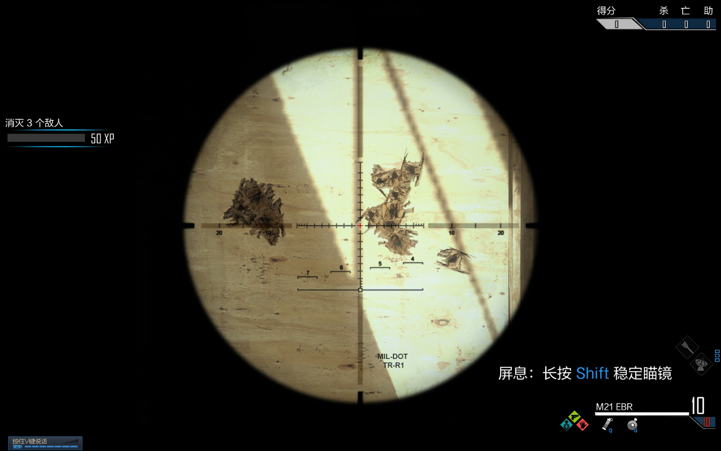 实战中M21 EBR后坐力非常小,这一点显然是优于瓦尔特2000的。但在远距离射击的时候,屏住呼吸中在第一发击中的时候会发生剧烈晃动,不能过分依赖。M21 EBR只有在击中头部后才能一击必杀,打其他部位则需要2枪或者更多,不过10发的弹匣容量保证了足够的持续火力。