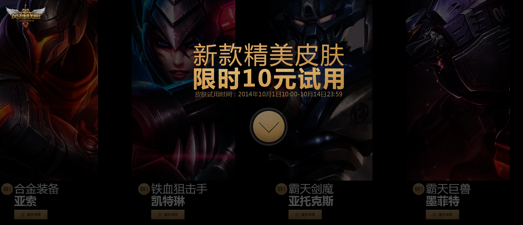据悉,lol将于2014年10月1日国庆节当天开展合金装备亚索、铁血狙击手凯特琳、霸天剑魔亚托克斯、霸天巨兽墨菲特四款皮肤租售活动,机不可失,下面就赶紧和小编一起来看看lol2014年国庆节有哪些皮肤租售吧?对了重要的是lol2014国庆节4款皮肤租售活动地址不是吗?赶紧来了解一下吧!