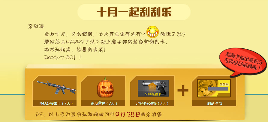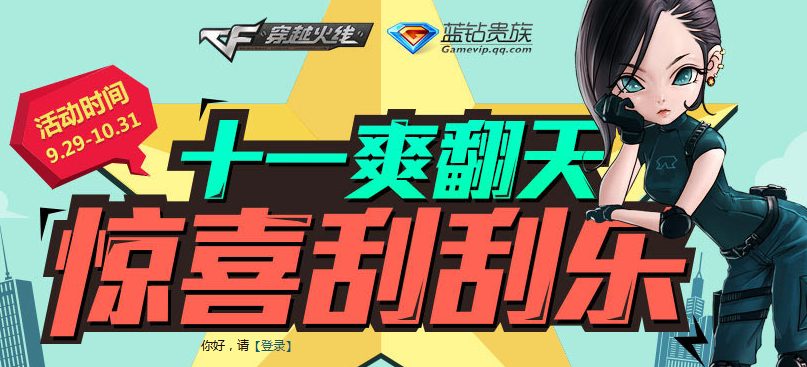 cf十一爽翻天惊喜刮刮乐活动在9月29日开启了,活动期间,最后一次游戏时间在2014.9.28前的玩家都可以领取刮刮卡礼包一份,所有玩家分享微博空间或每成功给好友送出1份国庆礼就可以领取奖励了,下面小编就给大家详细介绍cf国庆刮刮乐活动以及刮刮卡积分兑换奖励地址。
