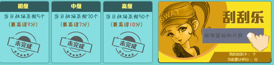 完成杀敌5个、20个、50个的任务,即刮开你的刮刮卡,获得积分。积分用于兑换道具。
