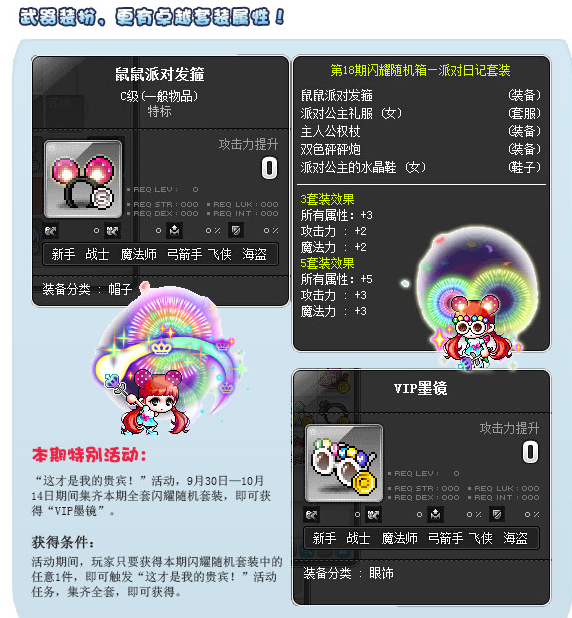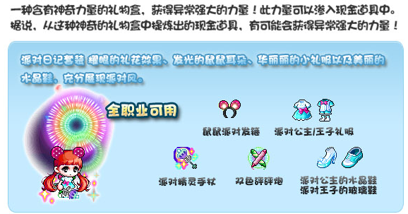 冒险岛闪耀宝物盒在9月30日上线了,可以获得派对日记套装哦!派对日记套装含鼠鼠派对发箍,派对公主/王子礼物,派对精灵手杖、双色碰碰炮、派对公主的水晶鞋/派对王子的玻璃鞋,下面小编就给大家详细介绍活动情况吧。