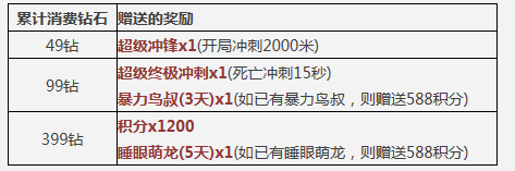 活动内容:活动期间,小伙伴们累计消费钻石达到以下额度,可以立即获赠相应额度的礼包哦!(注:活动期间,不同日期消费的钻石可以累加;每档礼包只能获得一次)