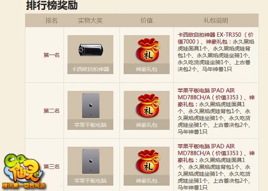 充值第1名玩家,将能获得价值7000元的“卡西欧自拍神器”,以及内含永久黑焰虎娃面具、永久黑焰虎娃背包、永久黑焰虎娃坐骑、永久吃货虎娃坐骑、上古兽决包2个、马年神兽的“神豪礼包”。第2、3名玩家,将能免费获得iPad Air,无需卖肾亦能得苹果。
