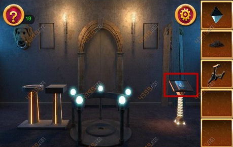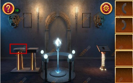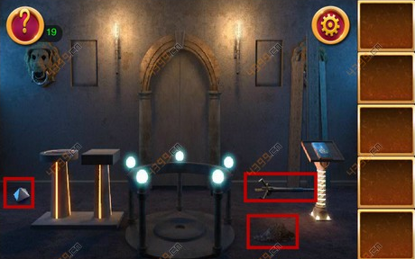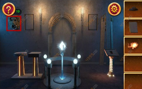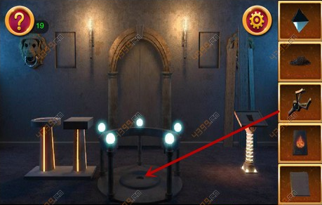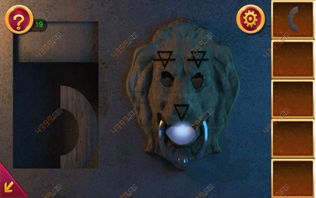 6.然后利用宝石将光牌变成光,再找到墙壁右边的狮子头,根据纸条的提示,石堆放进眼睛,光放进嘴巴,此时在左边的机关内可以得到圆环。