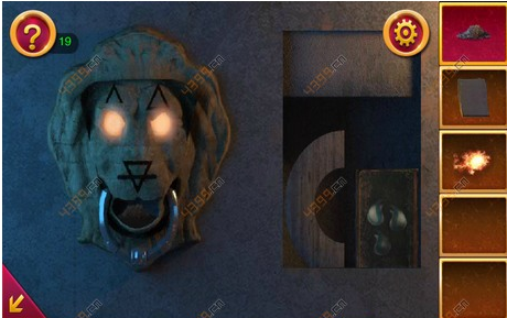 5.点击墙上左边的狮子头,根据纸条的提示,火放进眼睛里,石堆放进嘴巴里,此时在右边的机关处可以得到圆环和光牌。