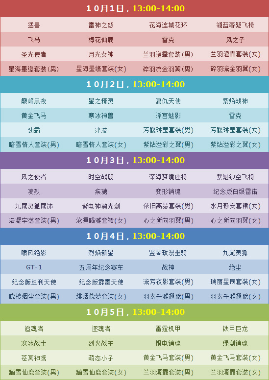 10月1日-10月5日期间,每天13点-14点为你准备一场极品拍卖,连着5天共5场,极品S车、极品机甲、永久A车、永久双人坐骑、永久套装、极品宠物等极品道具尽在其中,绝对不容错过哦!