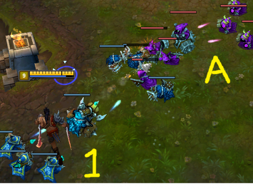 第一幅图中的兵线1代表的是第一波友军小兵,兵线A代表的是第一波敌方小兵。现在,如果想让这波兵压得更前,大家的第一反应普遍是快速收掉兵线A,让兵线1快点去跟兵线B互殴。虽然这样也能让自己家的兵线更快到敌方防御塔下,不过我今天要告诉大家的是另一个让小兵潮帮你对敌方队伍施压的方法,私以为效果更好。