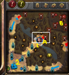如上图所示,如果你正在补兵线A,那么兵线1就会自动推到敌方塔下,承受防御塔的伤害直接挂掉。不可否认,初期用这种方法来干扰敌方对线、吃经验着实不错,把兵线带到敌方塔下后,你就可以回家更新装备了。不过我们现在来看看非对线阶段,双方的外塔都已经被推掉了。如果你要补掉兵线A,那么兵线1会到达内塔并在兵线B到来前死光,兵线B就会遇到你的兵线2。