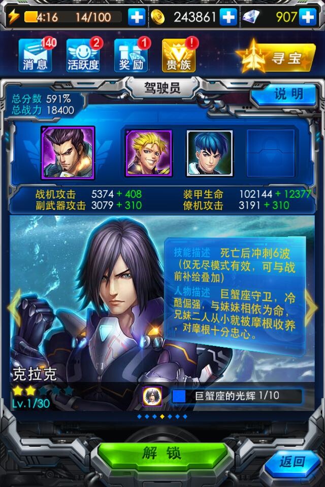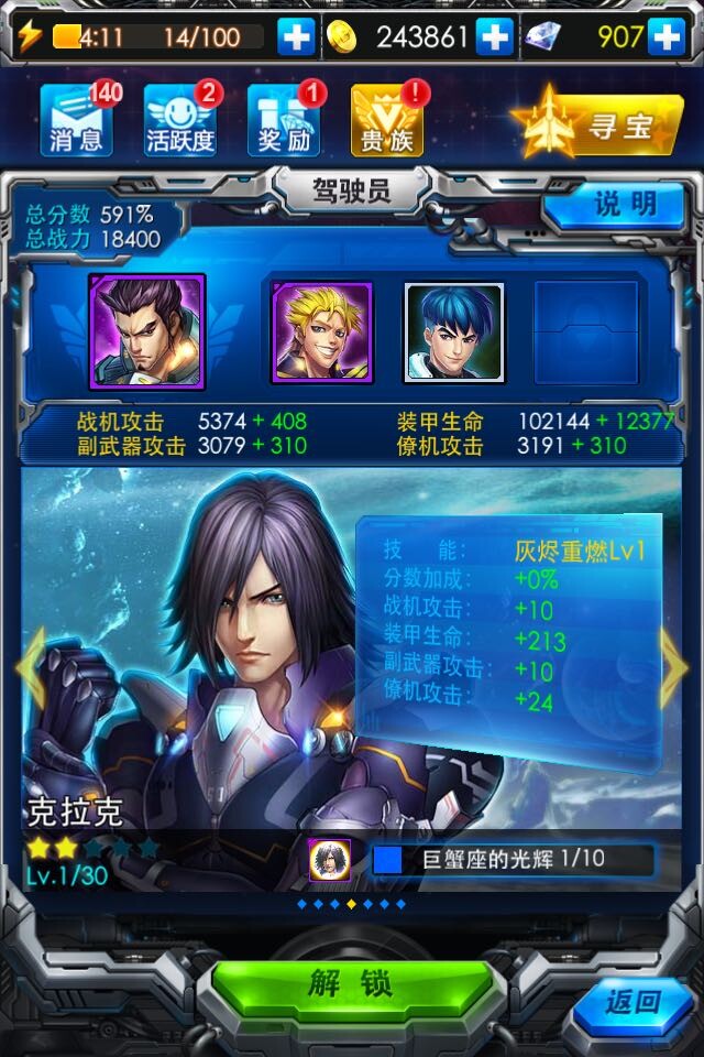雷霆战机新驾驶员克拉克属于低属性驾驶员,想要获得它,我们必须拥有10个巨蟹座星座光辉。