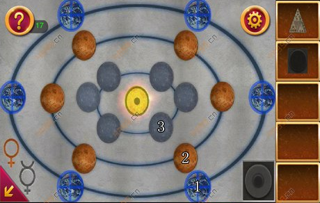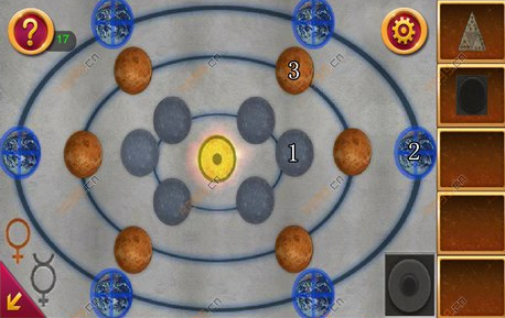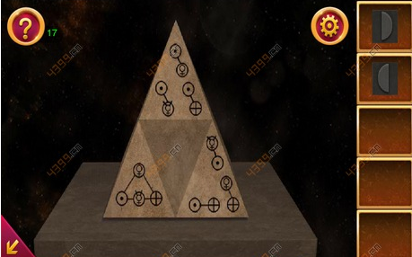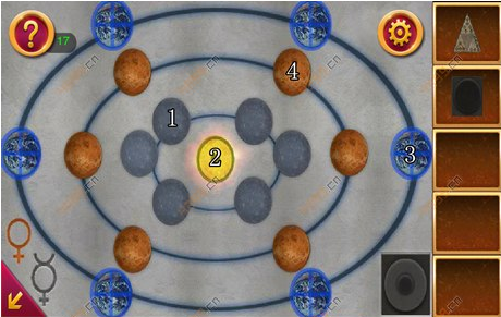 8.点击新楼梯上的石台,可以发现很多的球,按照三角形石板上的提示进行点击,点击分为三轮点击,下面小甲把点击的规律告诉大家(大家要记得图文结合哦)。