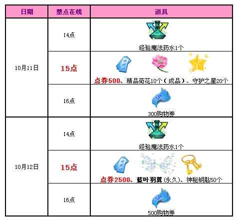 10.11-10.12每天14-16点期间将为大家开启四倍经验、四倍G币、四倍舞团资源活动。10月12日全天将开启双倍工资、双倍每日任务奖励、双倍宠物经验活动。