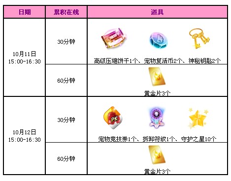 活动期间累积在线,即可获得宠物用品、拆卸符文、守护之星、黄金卡片等诸多好礼。