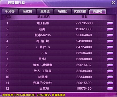 在对抗赛结束后,根据主播对抗排名排出该榜。这个榜单将展示前12名主播,且会展示本届对抗赛对主播贡献最高的后援团。