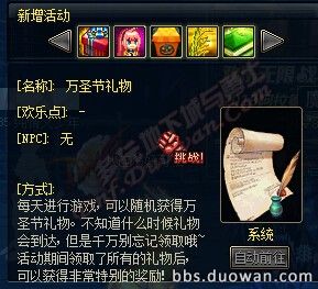 万圣节是西方传统节日,在每年的10月31日举行,据悉,为了庆祝2014年万圣节的到来,dnf日起开启了万圣节狂欢派对活动,据活动介绍,玩家们每天进行游戏,可以随机获得万圣节礼物,尽管礼物到达的时间还没确定,但小伙伴们千万别忘记领取哦!因为说不定珍贵的南瓜礼包就是你的啦!而南瓜礼包开启后是可以获得成长之契约或深渊派对邀请函等多种道具哦!