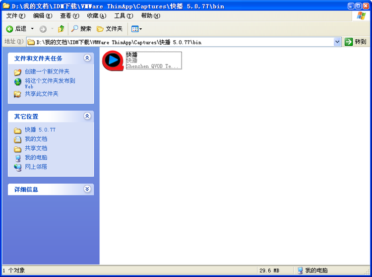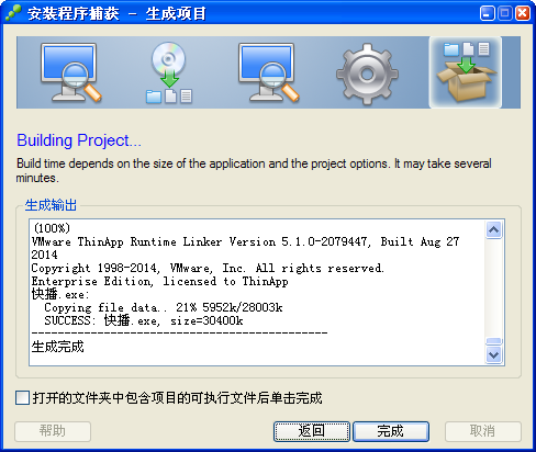 18、生成完成后出现此窗口,点击“完成”按钮, 便携版快播就已经制作完成,VMWare ThinApp会自动退出。