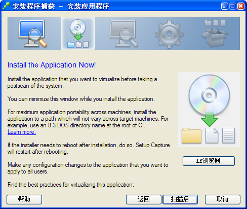 4、预扫描完成后,窗口显示“Install the Application Now!”文字时,表示VMWare ThinApp正在等待你安装软件。切记!此时不要点击窗口的任何按钮,电脑也不要进行任何无关的操作,此窗口放着别动!