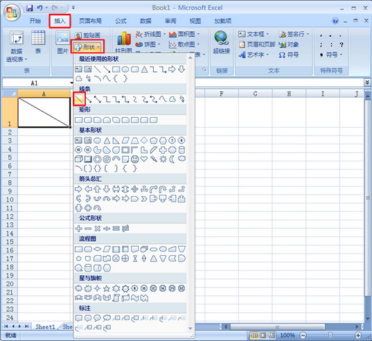 4.有时候可能需要在表头中绘制多条斜线,那么怎么来插入其他的斜线呢?选中需要绘制斜线的单元格,单击“插入”-“插图”-“形状”按钮,在弹出的下拉框中选择“线条”组中的“直线”。