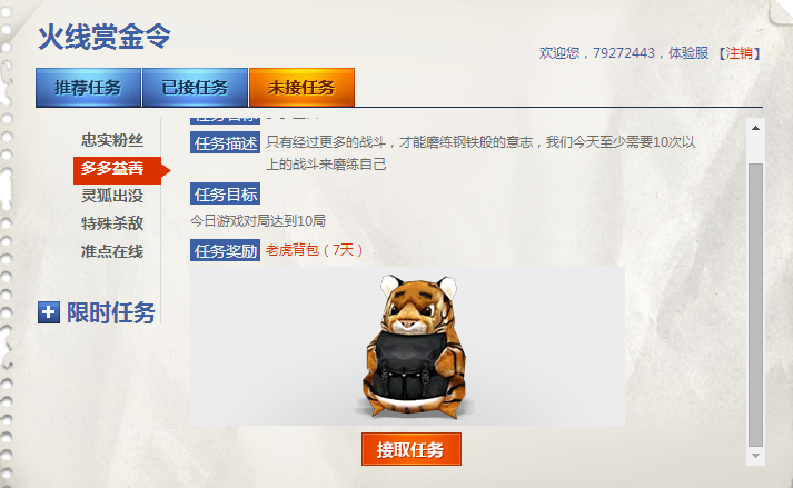 a、 通过游戏内入口进入火线赏金令主页,登陆之后即可查看赏金任务。