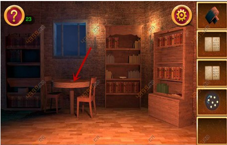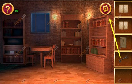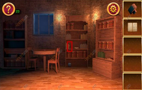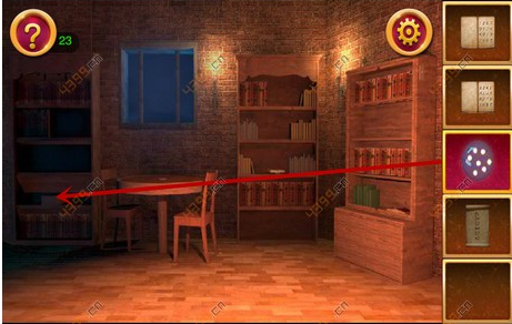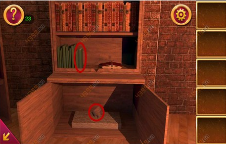 1.本关一开始先点击最右边的书架,将书架上的书收集起来,打开书架最下面的门,得到木轴。