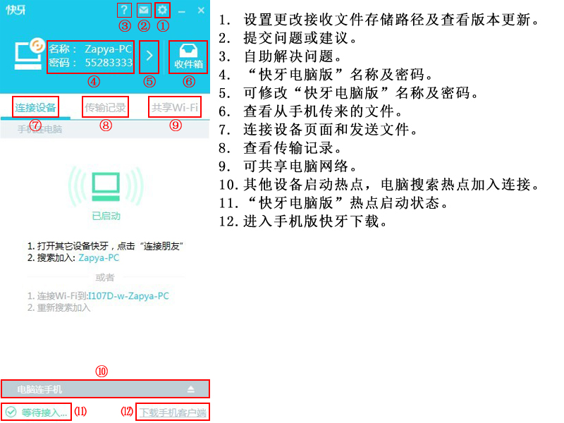 电脑与电脑连接必须有一台设备是Win7或Win8系统(不包括Win7家庭普通版),连接的多台电脑需在同一个线网或同一个WiFi环境内。Win7和Win8系统电脑方进入快牙创建连接,其他电脑进入快牙点开“图例10 【电脑连接手机】”加入连接。