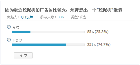 qq炫舞发起的投票因为最近挖掘机的广告语比较火,炫舞想出一个挖掘机坐骑,看来挖掘机坐骑已经离我们不远了。